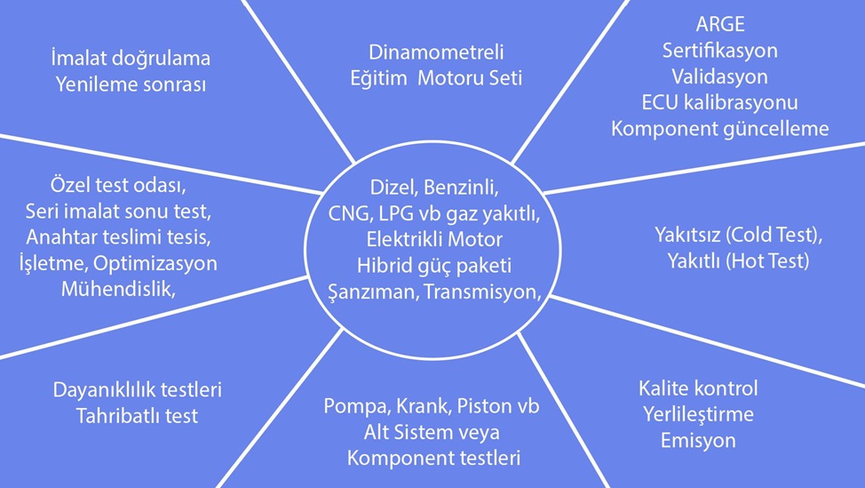 Firmamız dizel, benzin, elektrikli, lpg, cng veya benzeri yakıtla çalışan içten yanmalı motor, elektrik motoru, turboprop, turboşaft, türbin motor, araç, şanzıman, transaks vb tüm dönen makinaların laboratuvar ortamında tam yük altında testlerini yapan tesislerin ve bu tesislerde kullanılan cihazların tasarım, imalat, entegrasyon, kurulum, kullanım, satış sonrası destek, bakım, tamir, modernizasyon vb konularda hizmet veren konusunda uzman tek yerli tasarımcı ve imalatçı firmadır.
